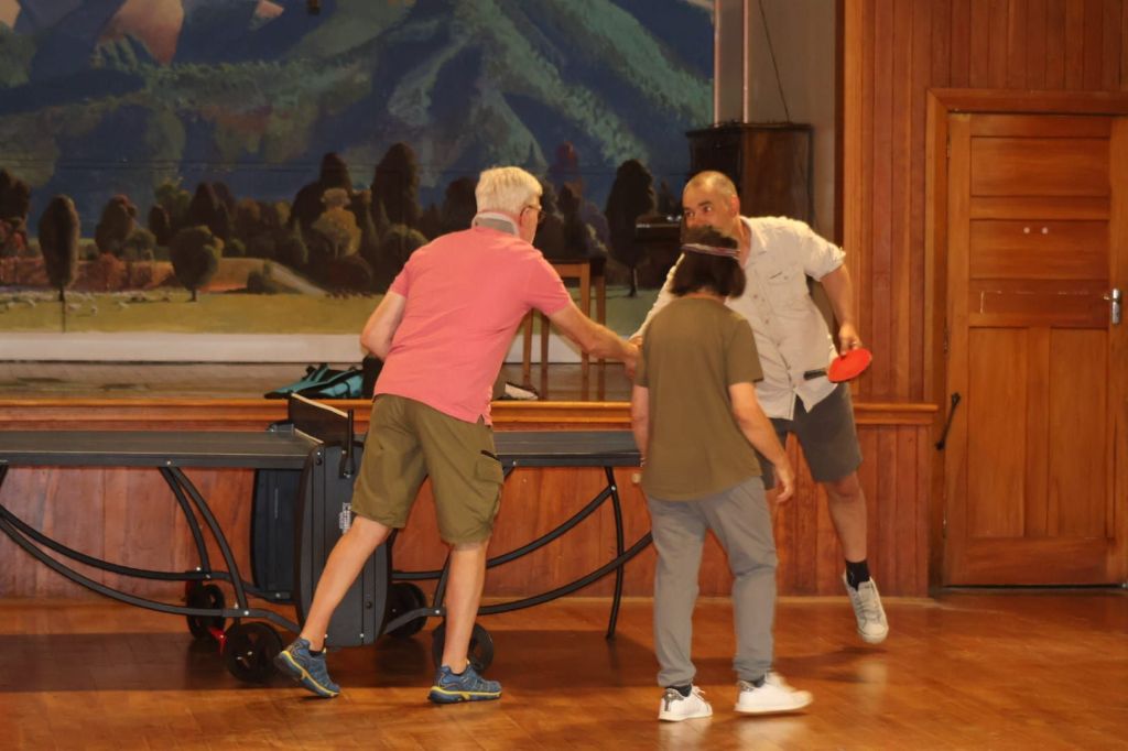 Unperturbed, as we could hear voices beyond the unlocked door, we tentatively entered in search of a notice board of events – only to find a retired man and woman, plus a younger man, playing table tennis 🏓🏓🏓