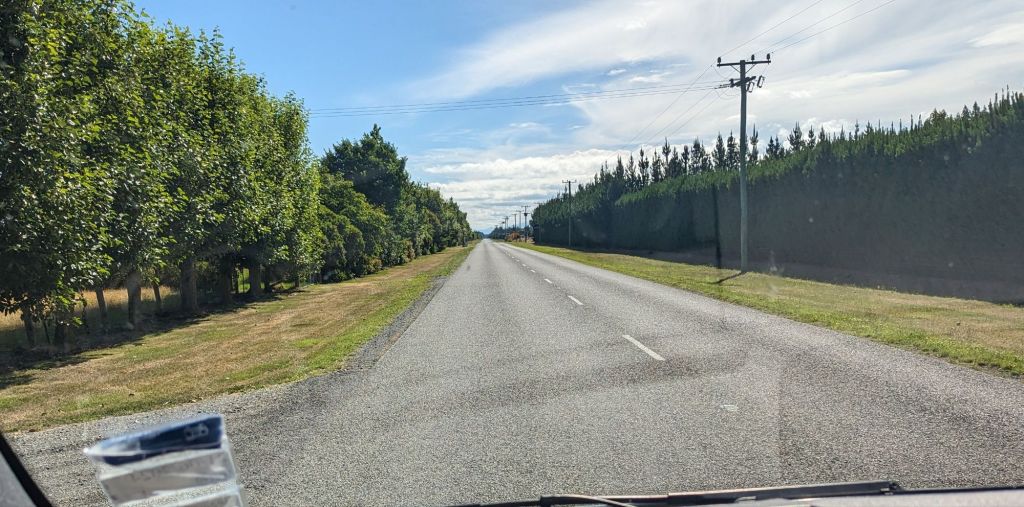 As we drove towards Ashburton along the arrow straight highway, we realised that the 6m high conifer hedges around farmland were much evident again..