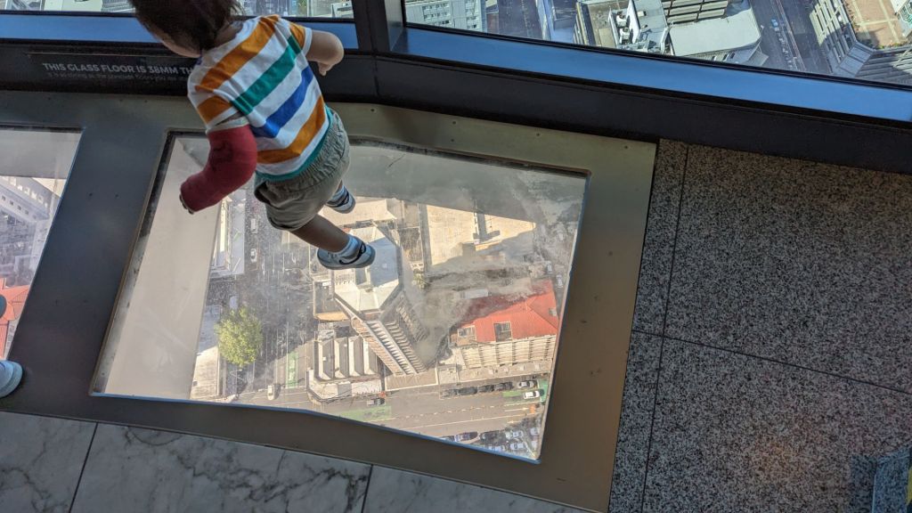 A jet lift then propelled us up to level 52 where we carefully, unlike some very brave toddler (whose mother kindly gave permission for the shot), avoided the glass tiles!