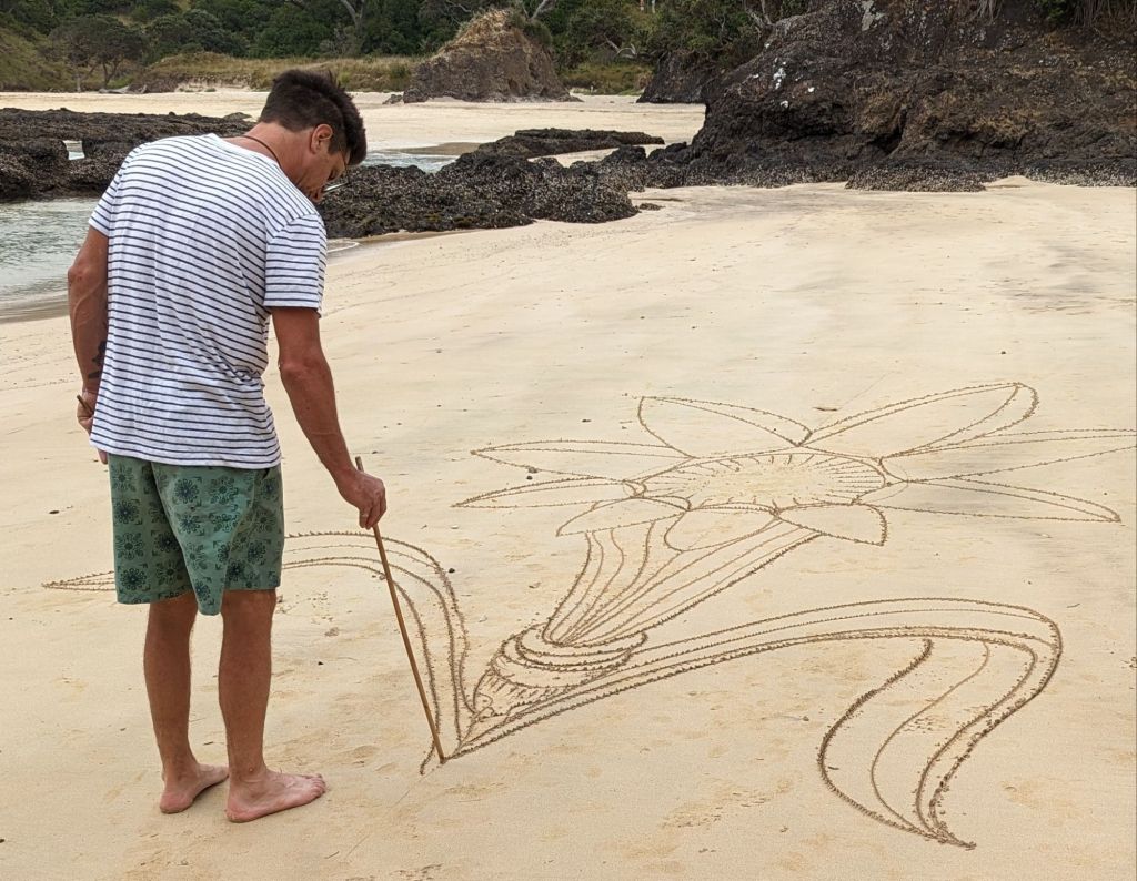 So I then jogged off barefoot to the other cove – no houses there – to take a look at the granite cliffs etc and met an accomplished beach artist in mid creation…