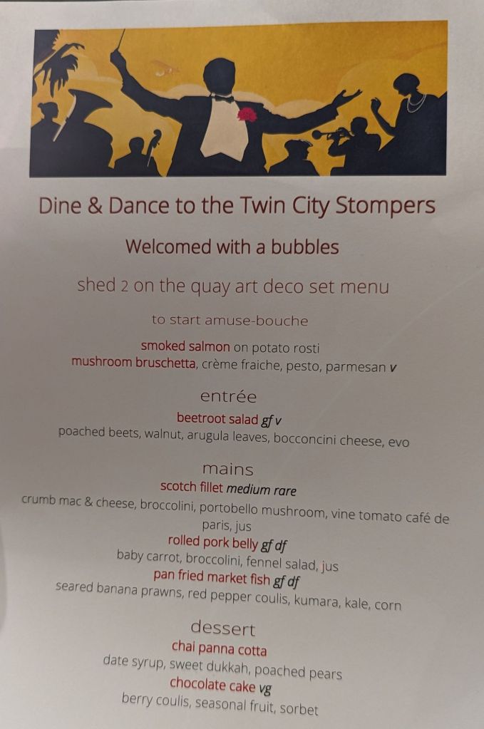 The atmosphere in this venue was both friendly – especially when we realised that 2 couples we had met at the Charleston class and in a gift shop in the afternoon were also both there; what’s the chances of that happening amongst 30,000 attendeesπ€ – and intimate with a jazz trio, The Twin City Stompers no less, providing very classy, danceable music…