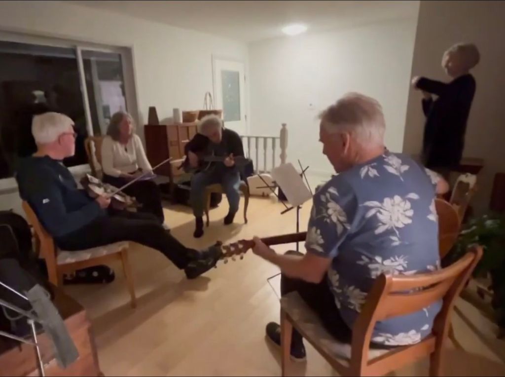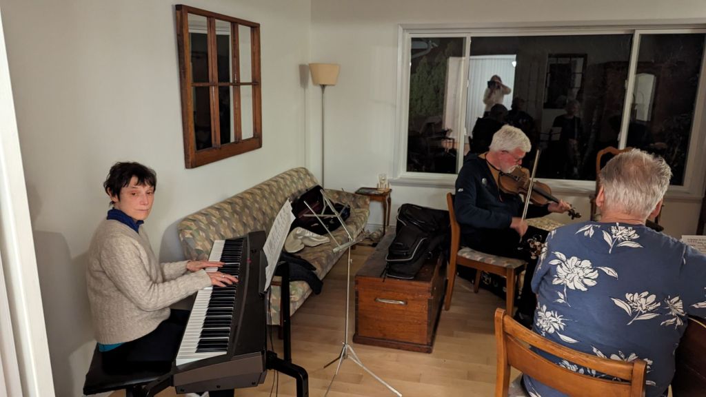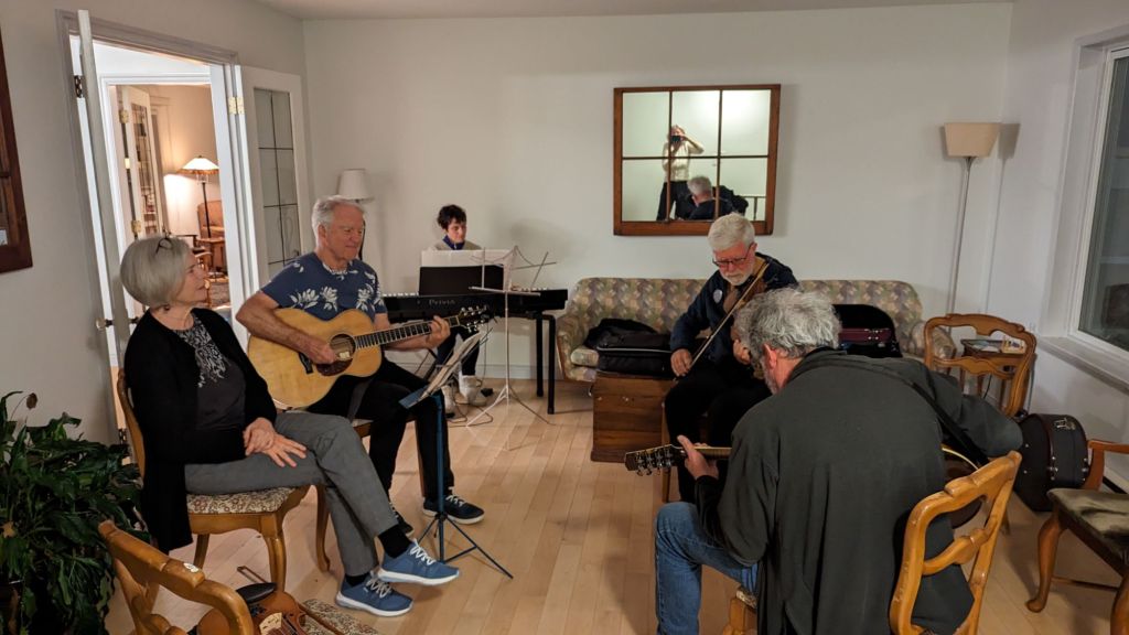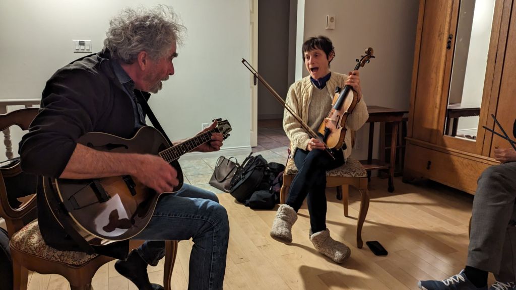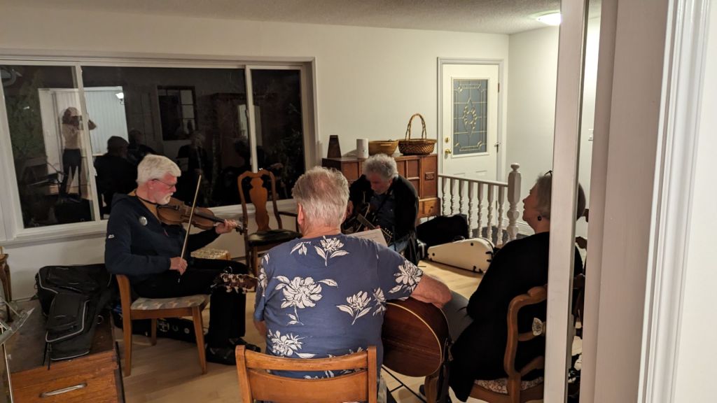 Julie sang at least 3 Burns’ songs, Beth and Bill gave us some ukulele/guitar based duets, Leith toggled between piano, fiddle and singing, Rob showed off his expertise on his pride and joy (made by BC based Michael Heiden) an octave mandolin no less – not an instrument I even knew existed prior to this wee session…