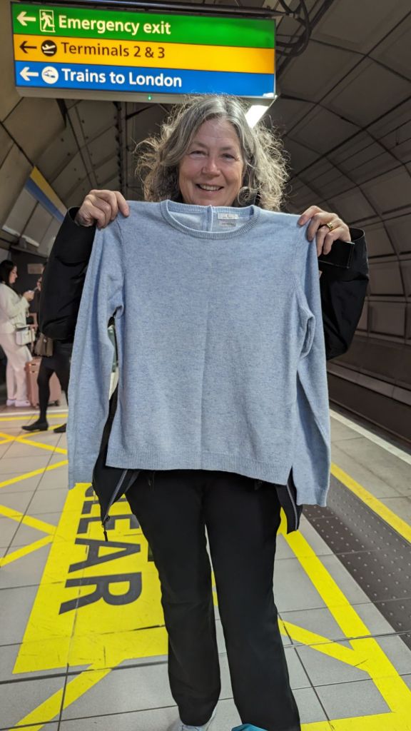 However, after finally disembarking, walking swiftly through this vast complex, getting a bus and being misdirected on wild goose chases 3 times, Julie and her cashmere jumper were finally re-united…